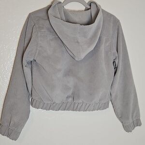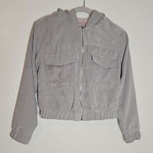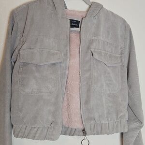 Trendy and cozy Haute Monde Los Angeles jacket made of soft gray corduroy with a plush pink faux fur lining. Features a front zip closure, two flap chest pockets, an attached hood, and an elastic hem and cuffs for a cropped fit. Stylish and warm — perfect for layering during fall and winter.