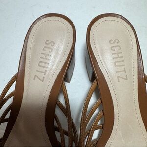 Elegant brown strappy mules by SCHUTZ. Feature multiple slim straps and decorative yellow bead accents. Block heel offers stable lift. Sleek open-toe silhouette for warm-weather wear.
