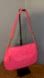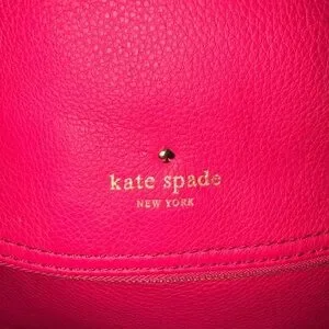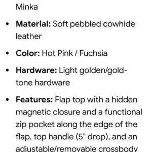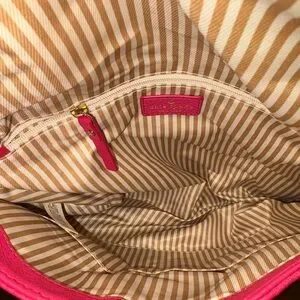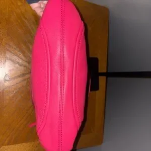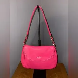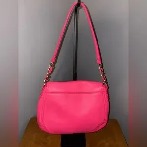 Pretty bright pink pebble leather handbag that has silver and gold accent hardware. Front flap magnetic closure which also opens with a zipper. Several open pockets on the inside and one zip closure pocket.
