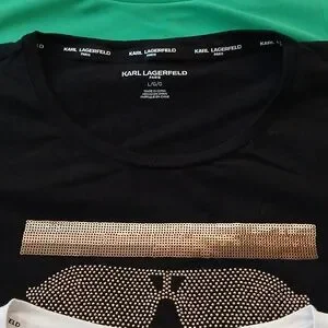 Fantastic set of three Karl Lagerfeld tops size L. Black tee with sunglasses motif, white tee with awesome three dimensional Paris scene, and a pretty green top with cool silver buttons. Fabulous like new condition. Check out my other listings to bundle and save!:)