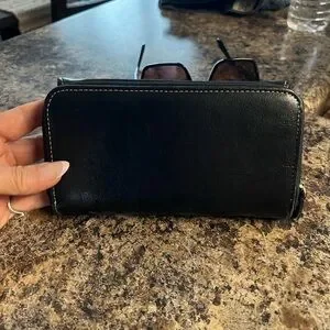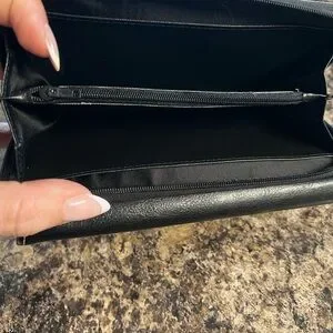 Prada leather wallet in classic black. White contrast stitching along edges. Flap closure with embossed Prada logo. Compact and refined design.