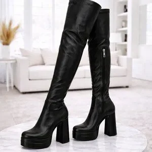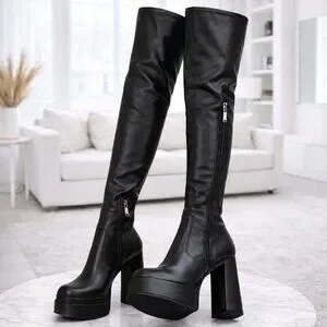 Stunning thigh-high boots that reach mid-thigh, featuring a bold and fashionable design perfect for elevating any outfit.