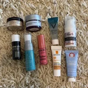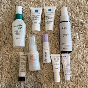 Large assortment of skincare, serums, creams, and hair samples. Includes a variety of brands and product types. Great for trying new formulas or travel. The first photo is of the entire assortment. The other photos are of it broken down into smaller segments for photos. All items are new.