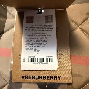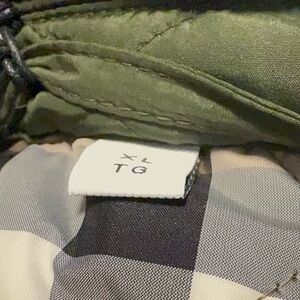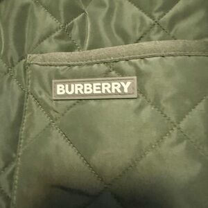 Burberry quilted puffer in olive green. Features classic beige check inner lining. Button-front closure and angled front pockets. Lightweight insulated design for everyday wear.