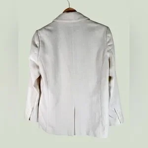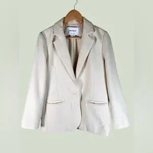 This stylish piece is the Ena Pelly Single Breasted Blazer in a versatile cream or off-white hue. It features classic notched lapels, a two-button front closure, and sleek jetted pockets for a polished, contemporary look.