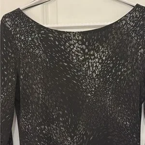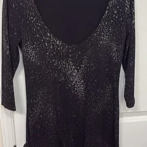 Elegant black dress with subtle metallic speckle detail. Soft, stretchy fabric flatters the silhouette. Three-quarter sleeves for versatile wear. Perfect for evening events or dressy occasions.