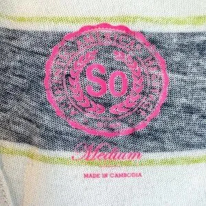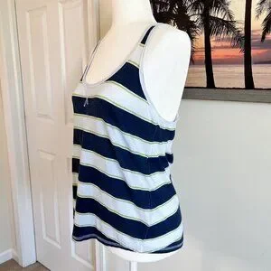 SO racerback tank top. Size medium. Navy and white striped with small bright green accent stripes. 100% cotton.