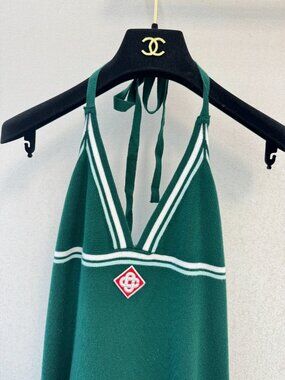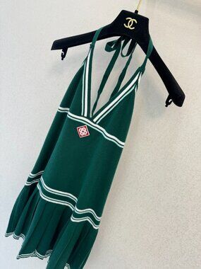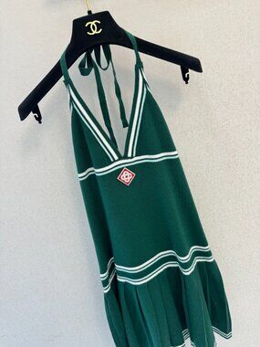 Brand new and authentic Casablanca halter mini dress in a vibrant green knit. This exclusive piece features a sophisticated pleated skirt, elegant halter neck design, and signature logo detailing, all in flawless, unworn condition.