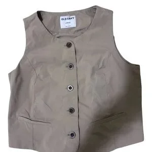 Chic beige vest with button front. Ideal for layering. Versatile style.