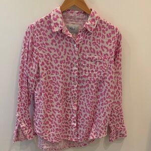 Lightweight button-up shirt with pink leopard print on a cream background. Single chest pocket. Soft, breezy fabric and relaxed fit. Great for layering or casual wear.