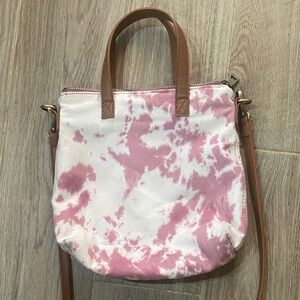 Stylish pink tie-dye canvas tote with brown leather handles and adjustable crossbody strap. Lightweight and versatile for daily use. The pink color adds a fresh, casual look.