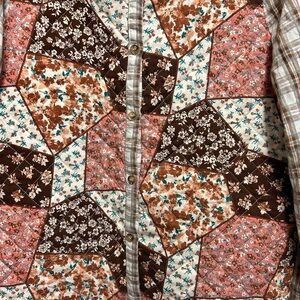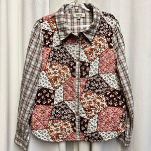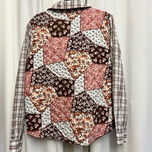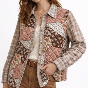 Rockin C quilted patchwork shirt jacket featuring a mix of floral and plaid prints in warm earthy tones. Lightweight quilted construction with button front and collared neckline gives it a cozy yet breathable feel—perfect for layering.