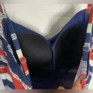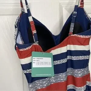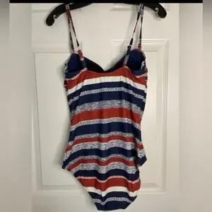 NWT Red, white, and clue striped one piece swimsuit, with removable adjustable straps, built in bra, hygiene liner attached. This give real 4th of July vibes! US size 12, 80% polyamide, 20% elastane.