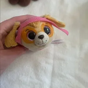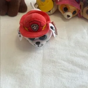 Six Ty Teeny Tys from the series paw patrol including rocky, skye, rubble, Marshall, tracker, and chase. Including one 6” Ty paw patrol Zuma Beenie boo. The rubble plush has something on it (the yellow bulldog) as shown in the pictures above.