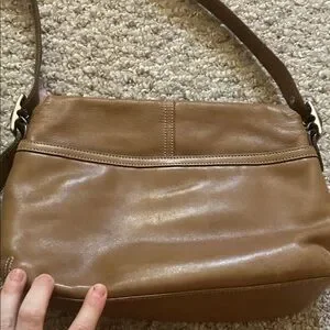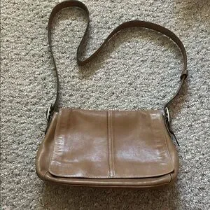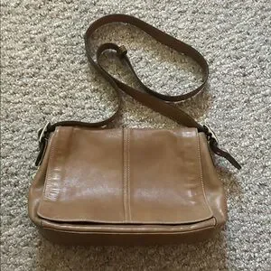 This Coach tan leather flap front snap closure shoulder bag is perfect for any occasion. Its sleek design and versatile color make it a must-have accessory. It is an excellent condition for a vintage piece and does fit a good amount . The interior has some compartments and zip little pocket. Adjustable shoulder strap - offers welcomed!