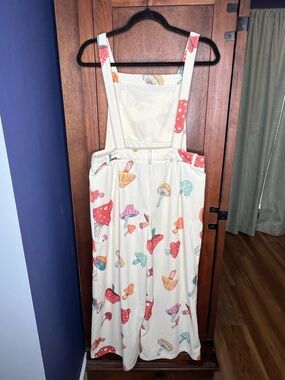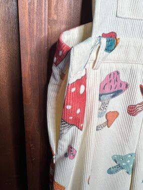 Pre-loved Cider corduroy overalls featuring a whimsical mushroom print in earthy tones on a soft beige base. Wide leg silhouette with non adjustable buttons straps, front bib pocket, and side zipper closure. Lightweight corduroy with a soft ribbed texture—perfect for cottagecore, fall layering, and statement casual looks.