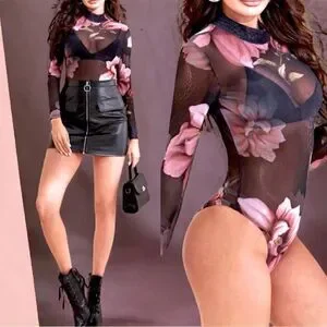 Bodysuit l Long-Sleeve l Black, Black trim, Floral Print l Sheer l New