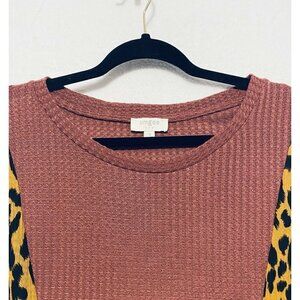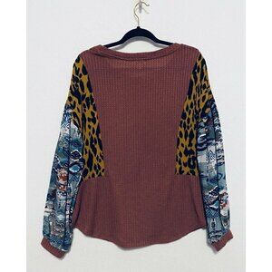 Umgee Womens Waffle Mixed Fabric Sleeve Top Cheetah Southwestern Small