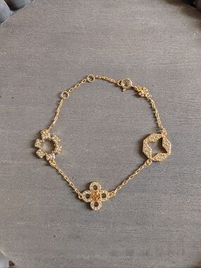 Tory Burch Forget Me Not gold chain charm connector bracelet with pave clover charms.
