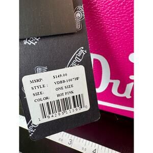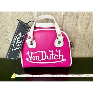 Get ready to turn heads with this absolutely stunning Pink Von Dutch Bowling Style Bag! It's brand new with tags, never used, and ready to become your next favorite accessory. This bag features the iconic Von Dutch flying eye logo boldly displayed on one side, perfectly complemented by the classic Von Dutch name text on the other, giving it that unmistakable retro flair. This vibrant pink bag is sure to add a pop of color and personality to any outfit!
