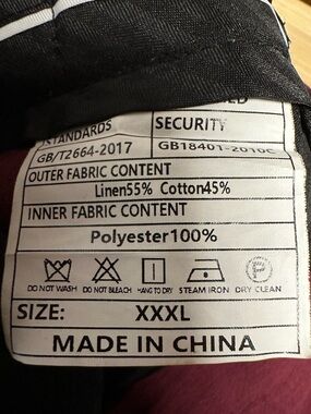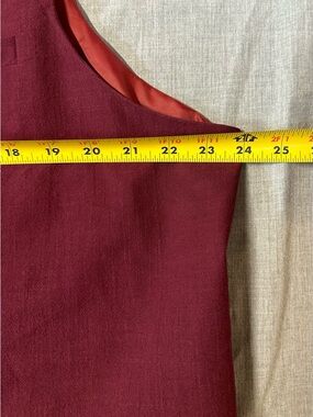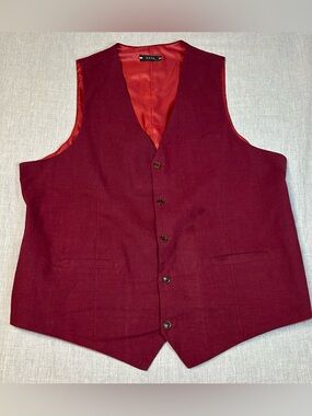 Linen and cotton suit! Light! Perfect for prom! Tailored two-piece suit in a deep wine Burgundy hue. Single-breasted jacket with notch lapel and front flap pockets. Matching vest with coordinating satin-like inner lining. Clean, versatile color for formal wear. Sz XXxl but please see measurements. Fit is small. Will fit for some one use to a XXL.