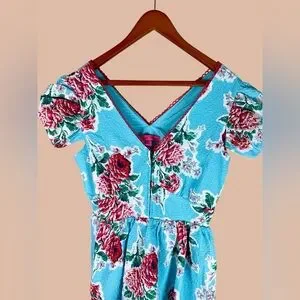 This dress is the Betsey Johnson Rose Garden Printed Seersucker Tea Dress. It is a vibrant turquoise/teal blue mini dress featuring a classic pink cabbage rose print.