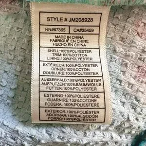Neckline: V-neckline detailed with red/pink scallop trim and a front zipper closure.
