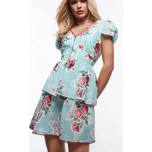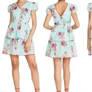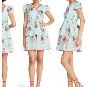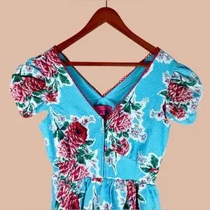 Betsey Johnson Teal Blue Floral Babydoll Tiered seersucker Tea Dress