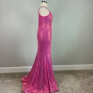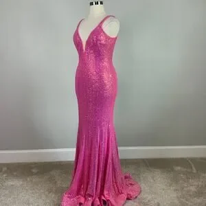Keywords: Jovani, Fuchsia, Hot Pink, Sequin, Mermaid Silhouette, Floor Length, Plunging V-Neckline, Sleeveless, Low V-Back, Train, Sparkly, Shimmer, Prom, Gala, Evening Gown, Formal, Special Occasion, Size 18, NWT.