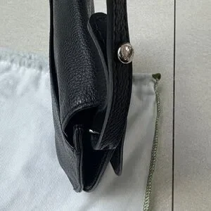 Compact pebbled leather saddle silhouette. Adjustable shoulder strap for versatile wear. Flap closure with a polished silver snap stud. Clean, minimalist styling for everyday use. Very good condition