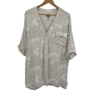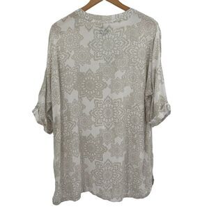 Life is Good white beige neutral print tunic size large. Floral print with sleeves that button up. Nice length. See photos for measurements and fabric content