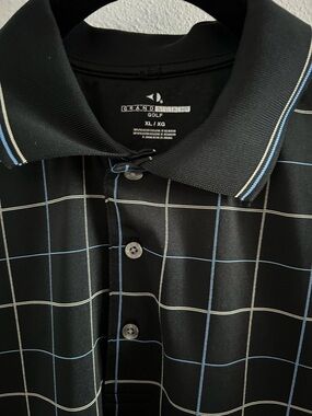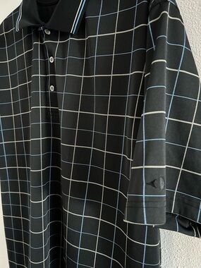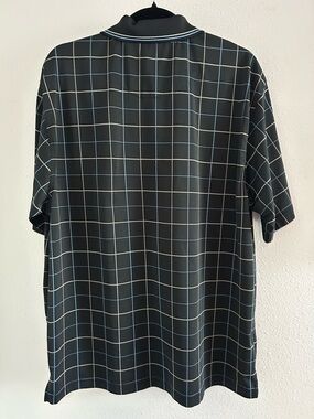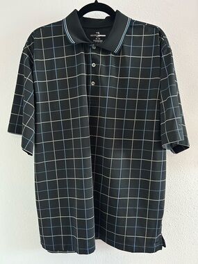 Grand Slam men's polo in a windowpane check. Black base with blue and white grid lines. Three-button placket and classic polo collar. Lightweight, breathable knit suitable for casual and golf wear.