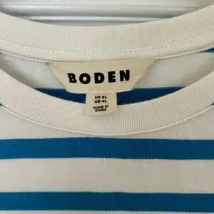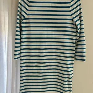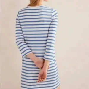 BODEN - Blue & White Breton Stripe Easy Fit Mini Dress w/ 3/4 Sleeve. 100% cotton.