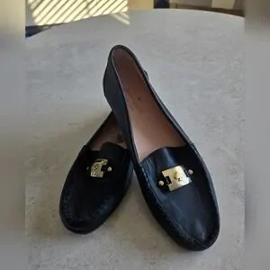 Kate Spade Black Leather Loafers with Gold-Tone Logo Accent