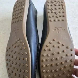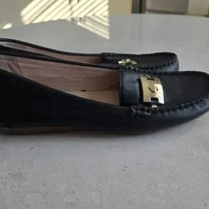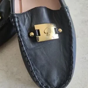 Sleek black leather loafers from kate spade. Gold-tone logo hardware on the vamp. Slip-on style with stitched moc toe. Polished look for work or casual wear. Very good condition and no peeling.