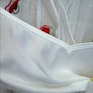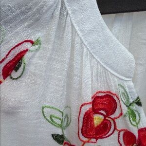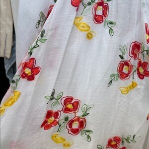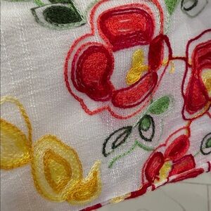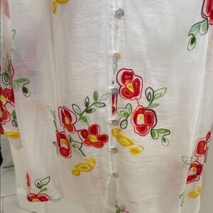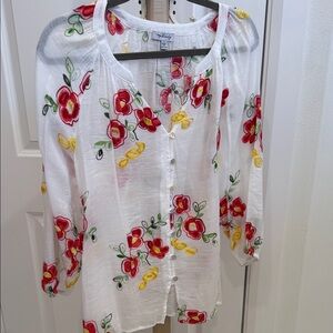 Lightweight white button-down top with bright red and yellow floral embroidery. Relaxed silhouette with a soft, breathable feel. Easy-to-wear neckline and classic button closure. Vibrant embroidery adds a feminine, summery touch to casual outfits.