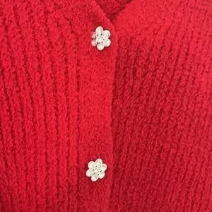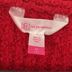 New without tags. No Boundaries bright red oversized Christmas winter cardigan sweater with 3 sparkly rhinestone floral shaped buttons. Size XS. 100.% polyester. Pit to pit measures 18 1/2”(sweater has a lot more stretch), and length measures 19”.
