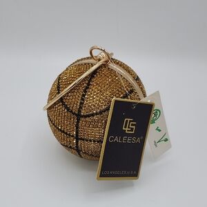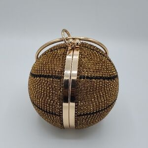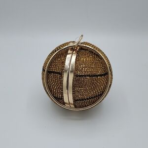 Caleesa gold basketball-shaped clutch with sparkling crystal embellishments. Elegant gold hardware and wrist strap for easy carrying. Eye-catching accessory that adds glamour to evening looks.