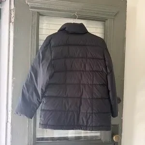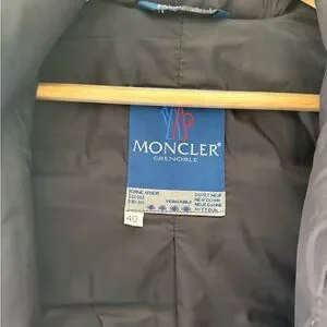 Moncler puffer coat in a deep black color. Quilted down construction for warmth. Snap-front closure with a high collar and zipper. Two angled front pockets for hand warmth. Clean, understated silhouette for versatile wear.