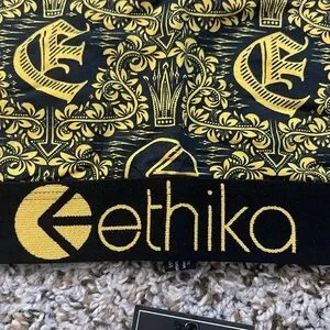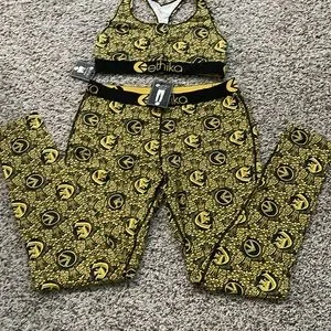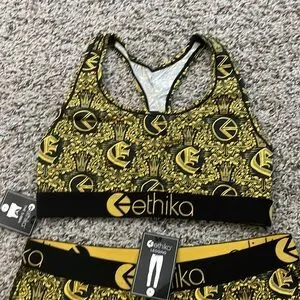 Stylish Ethika sports bra and leggings set. Features a bold yellow and black pattern. Perfect for workouts or casual wear.