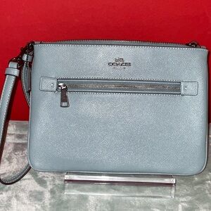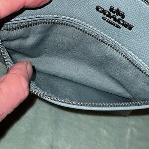 GREEN Coach crossbody wristlet in textured leather. Front zip pocket and top zip closure. Silver-tone hardware and detachable strap. Minimal Coach logo for subtle branding.NWOTS made in the Philippines she is green