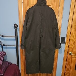 Size M-L..Relaxed long coat in dark olive with a contrasting corduroy collar. Features front snap closure and angled flap pockets for secure storage. Versatile layering piece that pairs well with casual and smart-casual looks.