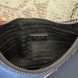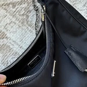 Sleek Prada shoulder bag in black nylon. Silver chain shoulder strap adds shine. Features the signature Prada triangle logo at front. Zip-top closure for secure carry. Compact and versatile for daily use.
