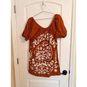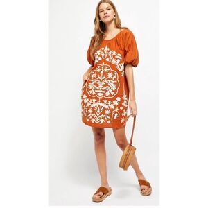 Free People Mini Dress Women Size M Rust Embroidered Puff Sleeve Open Back Boho