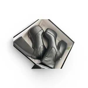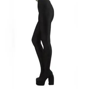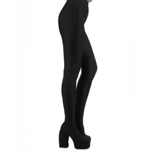 Azalea Wang HeyHey Disco Stretch Chunky Pant Boot in Black. It is an all-in-one pant-boot featuring a built-in high-waisted legging and a chunky heel platform. The material is listed as stretch PU (polyurethane) or a shiny spandex fabrication with a faux leather base.