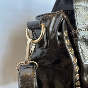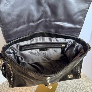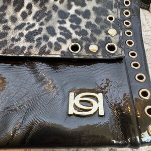 BEBE Large Handbag Leopard Grommet in Black and gray and gold
