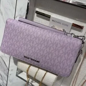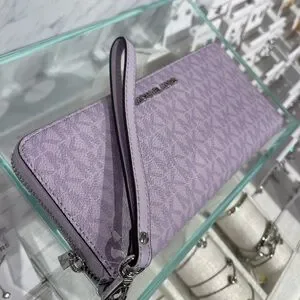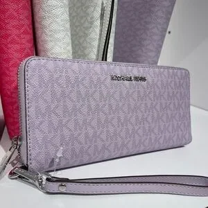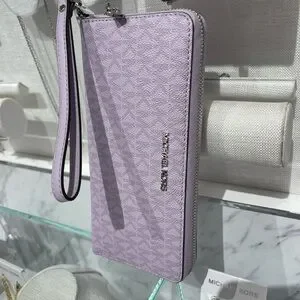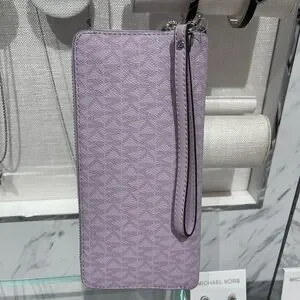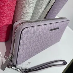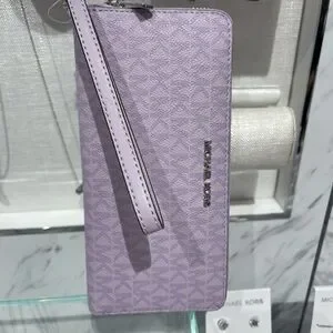 Chic Michael Kors wristlet in a stunning purple hue. Perfect for adding a pop of color to your outfit. Features a sleek design with a convenient wrist strap.