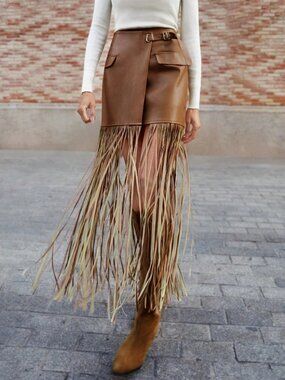 Embrace bohemian flair with this khaki wrap midi skirt, featuring a tassel‑trimmed hem and a stylish belt buckle detail. Designed with a high‑waist silhouette and regular fit, the short length adds a playful edge while the faux pockets provide visual interest. The flexible polyurethane fabric drapes smoothly, making it ideal for layered looks or effortless day‑to‑night style.