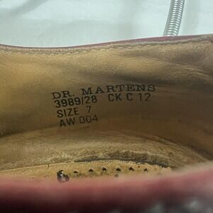 Brand markings: Interior stamping reading DR. MARTENS 3989/28, CK C 12, SIZE 7, and AW 004, and outsole text reading Made in England with oil, fat, acid, petrol, and alkali resistant callout.