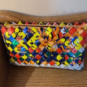 Handwoven multicolor clutch made from repurposed materials. Lightweight and eco-friendly with a top zip closure. Vibrant yellow, blue, orange, green and red tones create a bold look. Practical and stylish for everyday use or special outings.